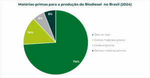 Em 2024, a principal matéria prima utilizada na produção de biodiesel no Brasil foi o óleo de soja, com 74% do total. Na sequência aparecem “outros materiais graxos”, com 14%, e a gordura bovina, com 6%. Outras matérias primas como óleo de palma ou dendê e gordura de frango dividem os 6% restantes.